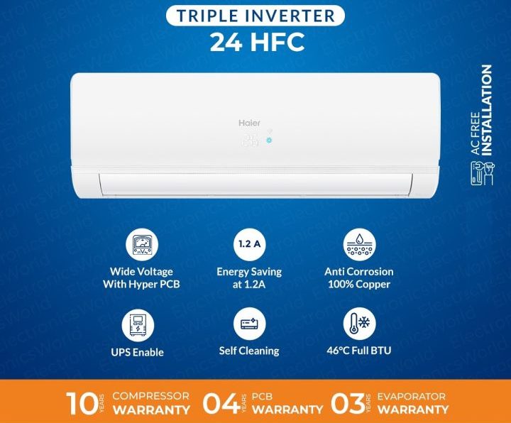 Specifications of Haier 2 Ton DC Inverter Split AC – Model 24HFC – UPS Enabled – Self Cleaning – Long Air Throw – 10 Years Compressor Warranty – Free Installation