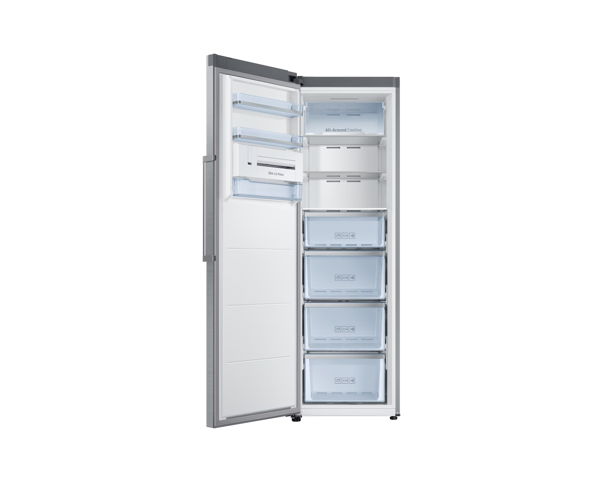 The Samsung RZ32M71207F/SG is a tall, 315-liter, single-door upright freezer with No Frost technology, a Digital Inverter Compressor, and the option to be paired with a matching refrigerator for a side-by-side solution.